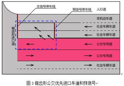 增設公交專用相位、增加公交通行次數和預信號優先控制等方法。被動優先具有預先設定公交優先配時方案、無需新增車輛檢測器等設備、適用于交通流較穩定的情形的特點。鋸齒形公交優先進口車道劃分和預信號是研究較多的被動優先,其設置方法如下圖所示。