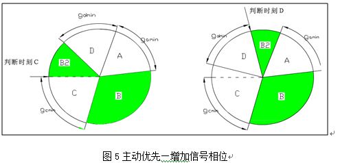 當信號燈為紅燈時公交車到達交叉口,且下一相位仍不允許公交車輛放行,那么在當前相位和下一個相位之間插入一個公交專用相位來實現公交優先,使該公交車盡快通過交叉口。插入優先相位時,容易導致其他相位車輛駕駛員心理準備不足。
