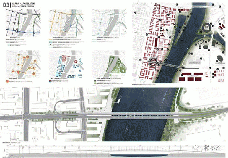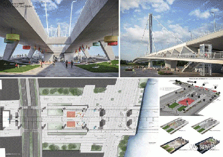 現在豐富的天然水邊和Csepel島上的大型綠地提供了一個獨特的機會,以促進河流和新的城市結構之間的密切聯系。除了提供優質交通解決方案的新橋梁主要功能外,橋梁應該是增強這種關系的完美工具,在兩個景觀河濱長廊之間建立人類規模的強大聯系。通過這種方式,可以在布達河和沿著河流南部的Csepel島尖端之間建立連續的綠化帶。