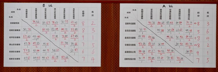 經過2天半小組賽的激烈角逐昆明晨晟、空港區住建局、昆明市住建局、盤龍區住建局位列A組1-4名小組出線,經開區住建局、市建筑院、軌道公司、高新區住建局位列B組1-4名小組出線