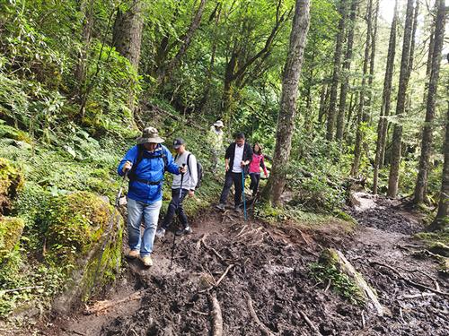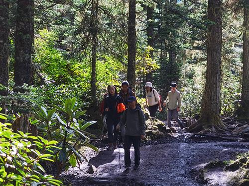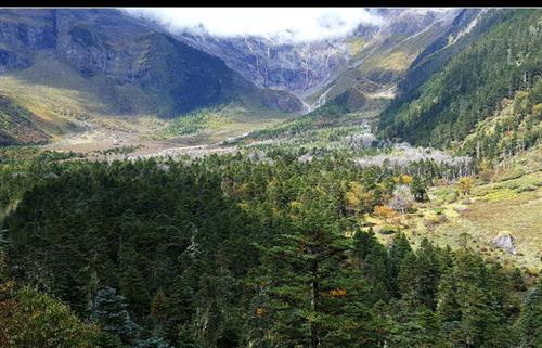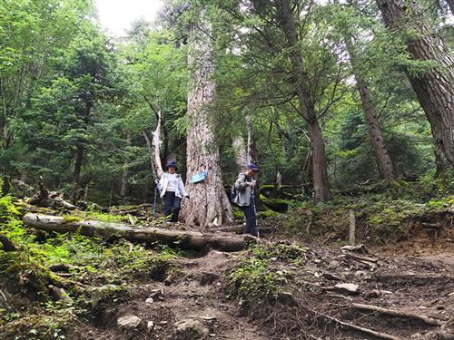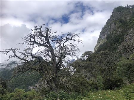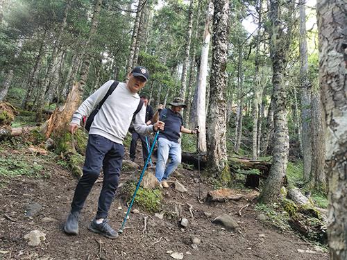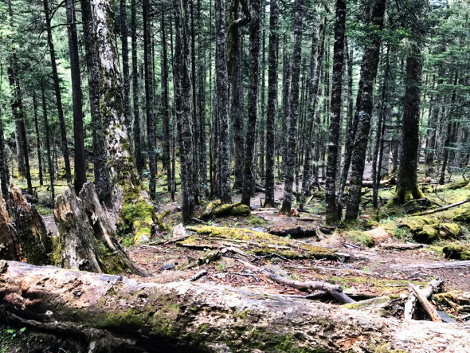 徒步12公里去海拔4250米的冰湖,爬升海拔1000米左右。先走進一段相對平緩的泥濘沼澤沙棘喬木林,恰似一個濃縮版的長征路線。穿過喬木林之后就進入了森林中,坡度逐漸變大,路也慢慢變得泥濘起來,隨著足跡的不斷深入,路上的標識也越來越少,潮濕的空氣中透著植物的清新味道,老樹巖石上的青苔也油綠油綠的,到處是幽靜的寫意。