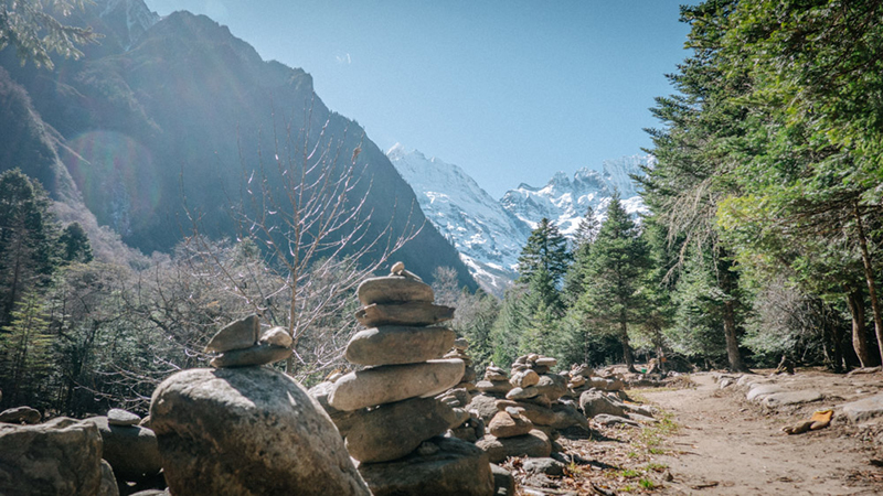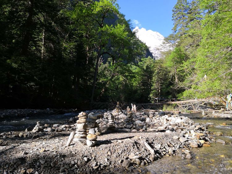 沿著山谷河流往前走,河邊灘涂上堆起了各式瑪尼堆,五彩經(jīng)幡也在山谷飄揚。不經(jīng)意間,這些都提醒我們梅里雪山是藏族人民心中的神山啊。
