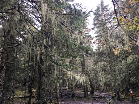 良好的生態(tài)環(huán)境造就了這里豐富的生物鏈,在高大密密麻麻冷杉林里徒步,曬不到太陽,所以不用怕高原強烈的紫外線。上下坡的坡度幾近八十度,攀爬起來很是吃力,加之地面潮濕路滑,每走兩步都需要停下腳步稍作休息,心臟驟跳不停,分分鐘爆表的節(jié)奏在躍動。